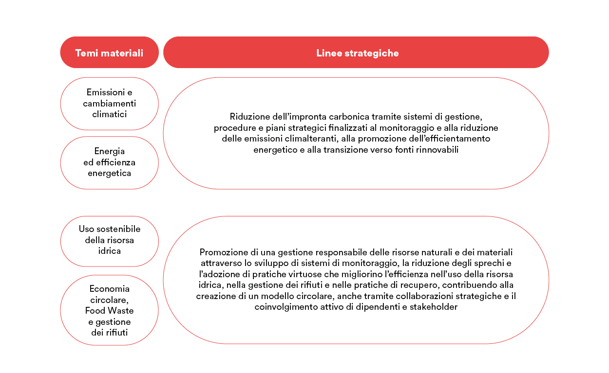 Puntiamo a ridurre la nostra impronta carbonica attraverso l’efficientamento energetico e la transizione a fonti rinnovabili. Vogliamo promuovere una gestione responsabile delle risorse naturali, concentrandoci sul monitoraggio dei consumi idrici e su pratiche di economia circolare.