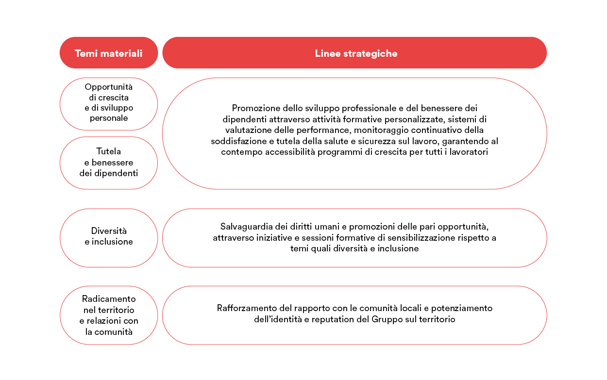 Ci impegniamo a favorire lo sviluppo professionale e il benessere dei dipendenti con la creazione di attività formative personalizzate e la tutela della salute e della sicurezza. Lavoriamo per la salvaguardia dei diritti umani e delle pari opportunità, focalizzandoci su diversità e inclusione.