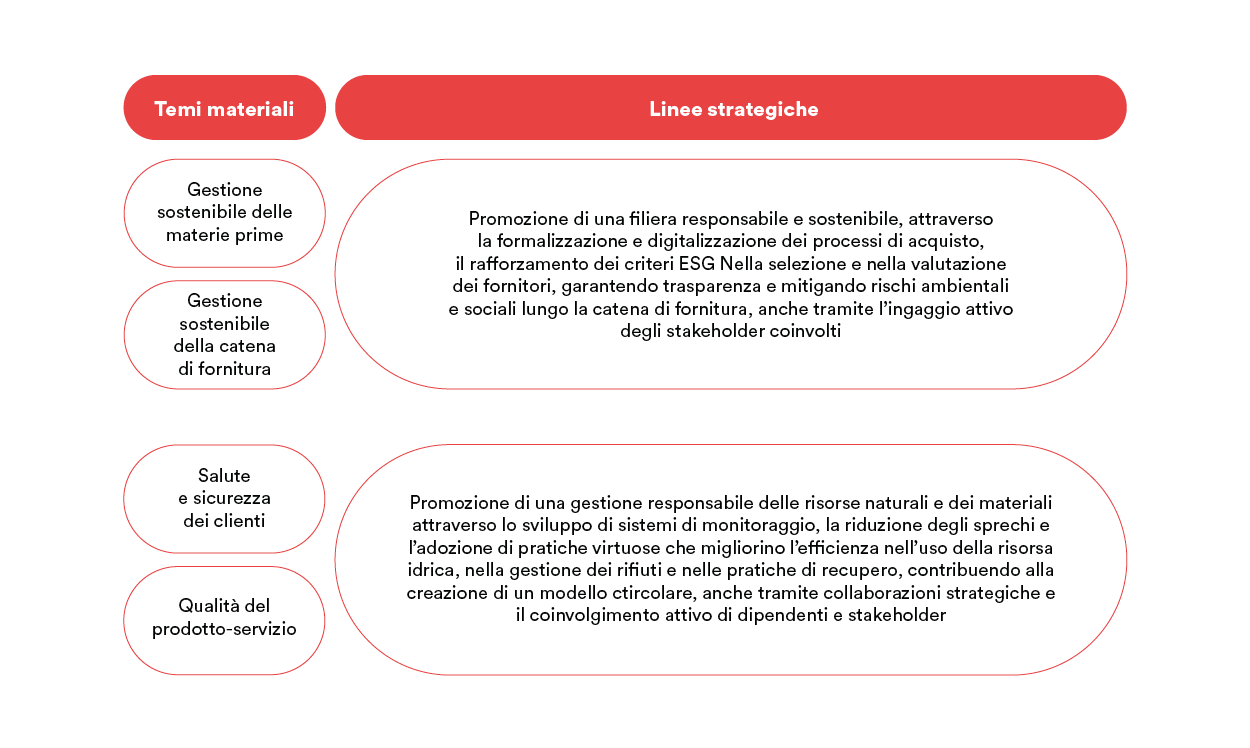 Il Piano Strategico di Sostenibilità si inserisce in una visione più ampia e radicata di crescita responsabile. Per noi, crescere significa sviluppare il business, ma anche evolvere in armonia con l’ecosistema, generando benessere diffuso. Il punto di partenza per la stesura del piano è stata l’analisi di materialità. Questo processo ci ha permesso di identificare temi prioritari, traguardi e azioni specifiche su quattro direttrici principali.